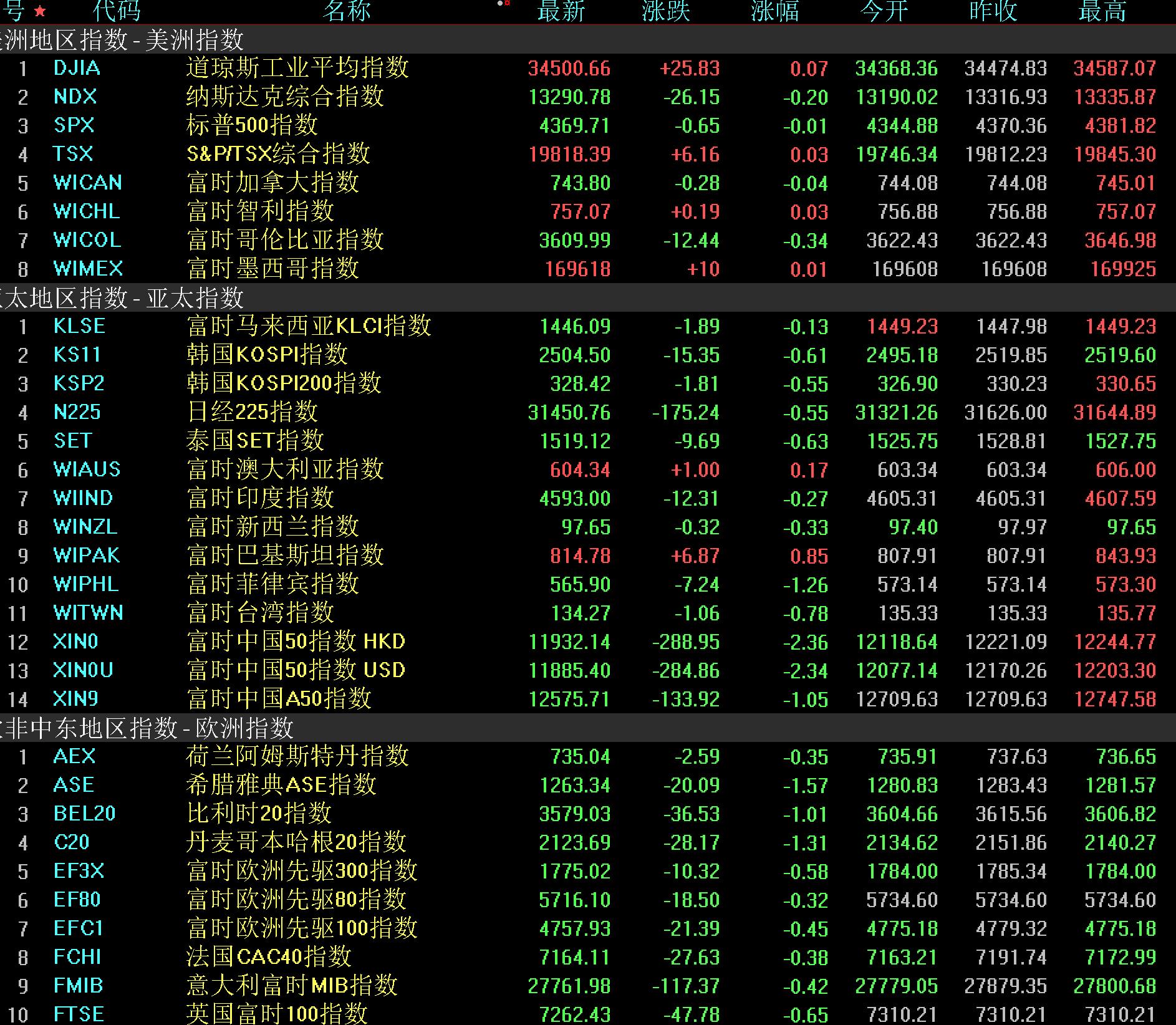 周五,美國(guó)三大股指收盤漲跌不一,道指漲0.07%報(bào)34500.66點(diǎn),標(biāo)普500指數(shù)跌0.01%報(bào)4369.71點(diǎn),納指跌0.2%報(bào)13290.78點(diǎn)。本周,道指跌2.21%,標(biāo)普500指數(shù)跌2.11%,納指跌2.59%;標(biāo)普500指數(shù)和納指錄得周線三連跌。