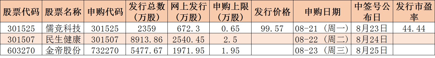 根據(jù)發(fā)行安排,下周(8月21日-25日)有3只新股發(fā)行,其中8月21日周一發(fā)行的是儒競(jìng)科技,公司是專業(yè)變頻節(jié)能與智能控制綜合方案提供商,發(fā)行價(jià)為99.57元/股;8月22日周二發(fā)行的是民生健康,公司是集維生素與礦物質(zhì)類非處方藥品和保健食品研發(fā)、生產(chǎn)、銷售于一體的高新技術(shù)企業(yè);8月23日周三發(fā)行的是金帝股份,公司的主營(yíng)業(yè)務(wù)為精密機(jī)械零部件的研發(fā)、生產(chǎn)和銷售。