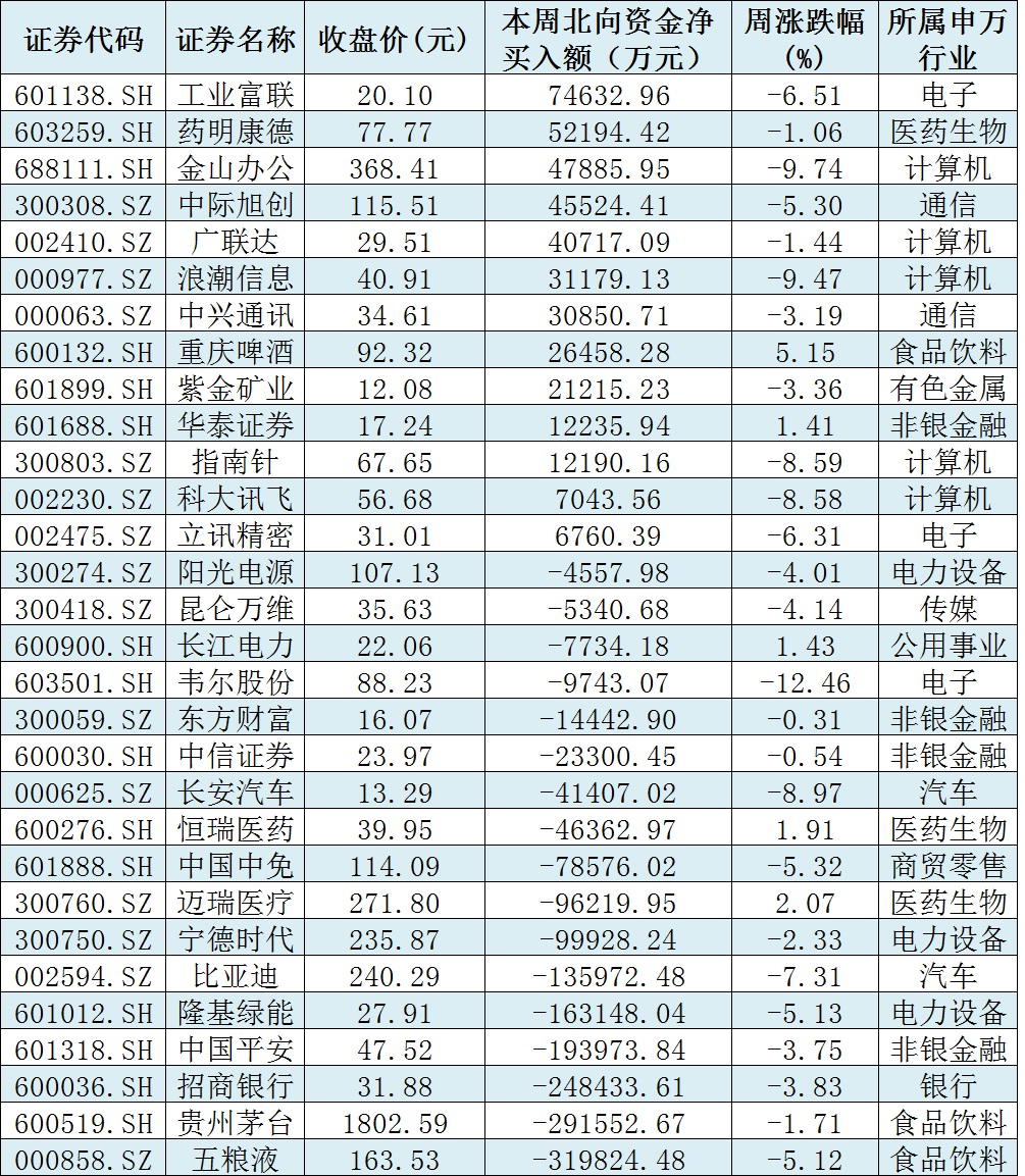 資金方面,周五,北向資金凈賣出85.22億元,已連續(xù)10個(gè)交易日凈賣出,創(chuàng)歷史最長(zhǎng)連續(xù)凈賣出天數(shù)紀(jì)錄。本周北向資金累計(jì)凈賣出金額達(dá)291.16億元。從前十大成交活躍股來(lái)看,本周,工業(yè)富聯(lián)、藥明康德等2只個(gè)股,北向資金凈買入金額均超5億元。另外,五糧液、貴州茅臺(tái)、招商銀行等3個(gè)股遭北向資金凈賣出金額均超20億元。