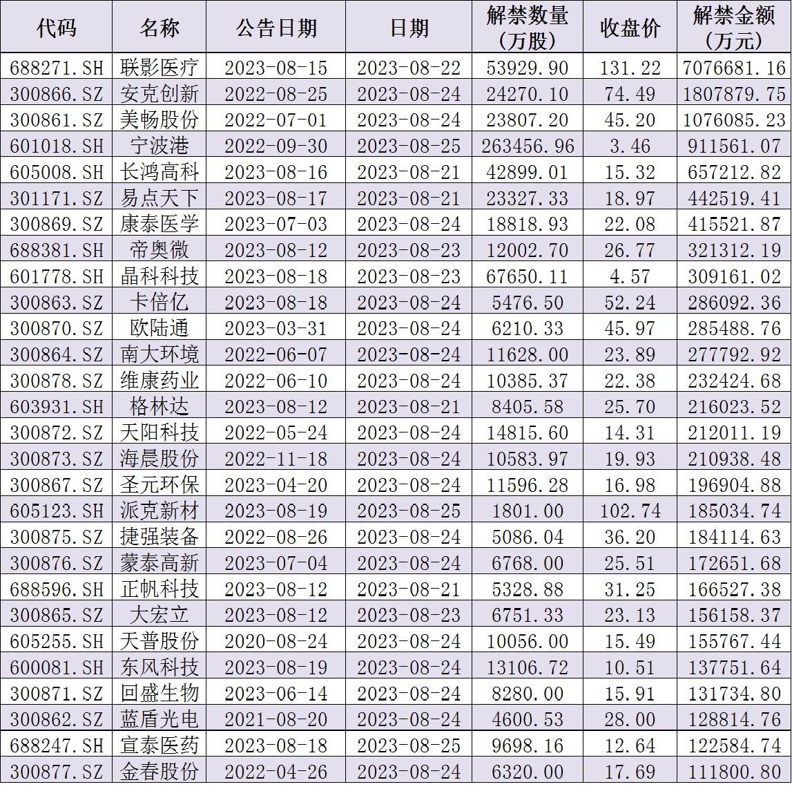 與此同時(shí),據(jù)同花順統(tǒng)計(jì),下周(8月21日-25日)共有69家公司限售股陸續(xù)解禁,按最新收盤價(jià)計(jì)算,解禁市值為1740.02億元。從解禁市值來(lái)看,聯(lián)影醫(yī)療(707.67億元)、安克創(chuàng)新(180.79億元)、美暢股份(107.61億元)等公司解禁金額均超100億元。