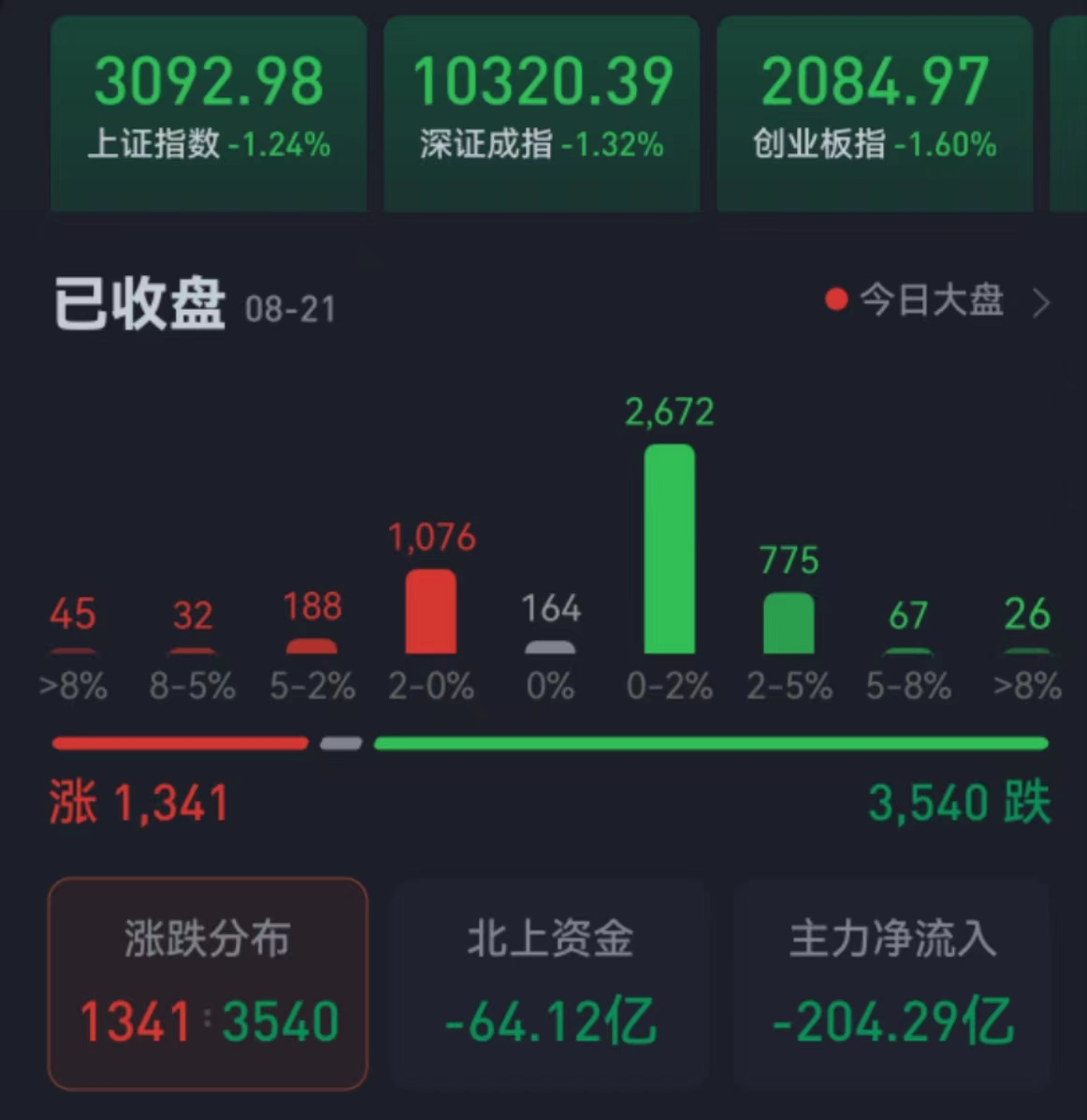 周一(8月21日),A股三大股指震蕩下行,跌幅均超1%。截至收盤,上證指數(shù)跌1.24%報3092.98點(diǎn),失守3100點(diǎn)整數(shù)關(guān)口;深證成指跌1.32%報10320.39點(diǎn),創(chuàng)業(yè)板指跌1.6%報2084.97點(diǎn);兩市合計成交金額達(dá)6782.62億元,北向資金凈賣出64.12億元??傮w上看,兩市個股跌多漲少。其中,漲停個股達(dá)38只,跌停個股達(dá)6只。