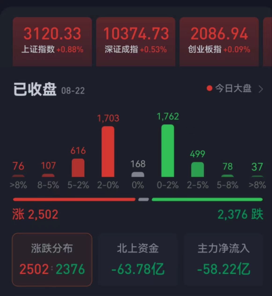 周二(8月22日),A股三大股指震蕩上行,全線飄紅。截至收盤,上證指數(shù)漲0.88%報3120.33點,深證成指漲0.53%報10374.73點,創(chuàng)業(yè)板指微漲0.09%報2086.94點;兩市量能有所放大,合計成交金額達8183.8億元,北向資金凈賣出63.78億元。總體上看,兩市個股漲多跌少,上漲個股2502只,略多于下跌個股。其中,漲停個股達45只,跌停個股達14只。