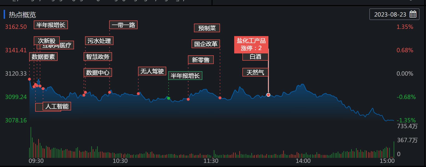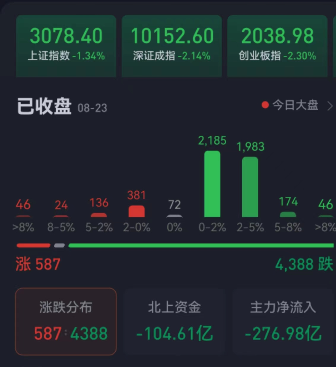 周三(8月23日),A股三大股指震蕩下行,跌幅均超1%。截至收盤,上證指數(shù)跌1.34%報3078.4點,深證成指跌2.14%報10152.6點,創(chuàng)業(yè)板指跌2.3%報2038.98點;兩市合計成交7059.16億元,北向資金凈賣出104.61億元,連續(xù)13日凈賣出??傮w上看,A股個股跌多漲少,下跌個股近4400只。其中,漲停個股達36只,跌停個股達19只。