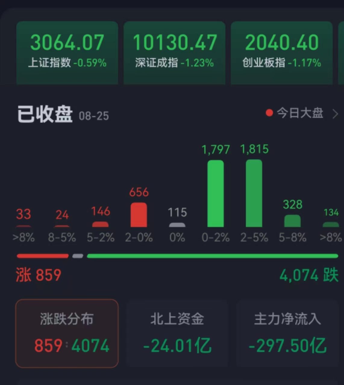 周五(8月25日),兩市合計(jì)成交金額7662.9億元,北向資金凈賣(mài)出24.01億元。總體上看,兩市個(gè)股跌多漲少,超4000只個(gè)股下跌。其中,漲停個(gè)股達(dá)23只,跌停個(gè)股達(dá)39只。