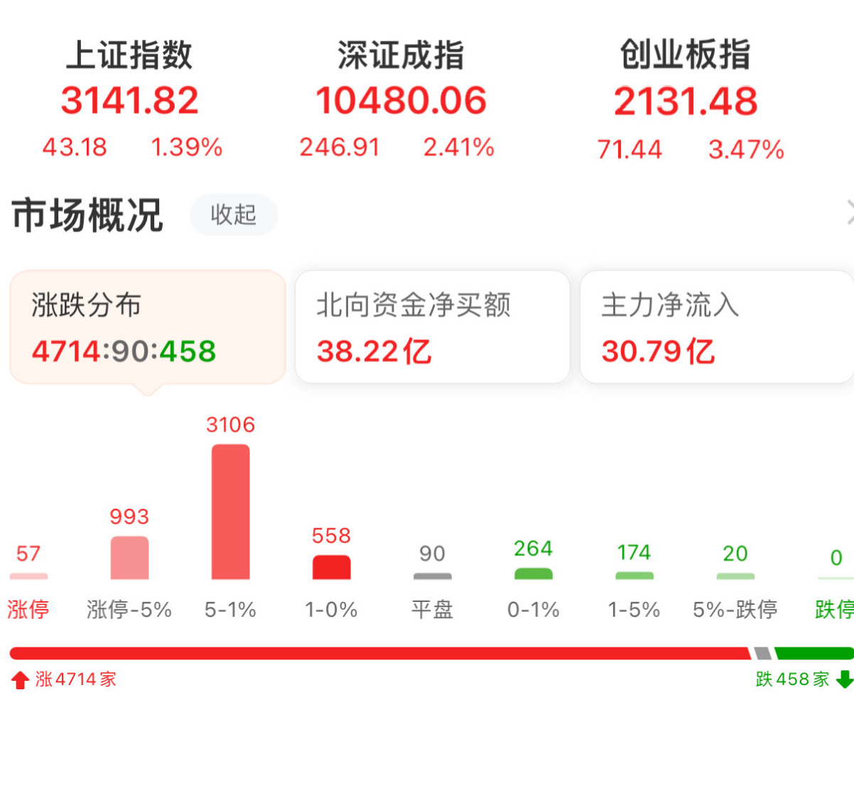周二(8月29日),三大股指集體漲超1%。截至上午收盤,上證指數(shù)漲1.39%,報3141.82點;深證成指和創(chuàng)業(yè)板指分別漲2.41%和3.47%;滬深兩市合計成交額6264.51億元,總體來看,兩市個股漲多跌少,4714只個股上漲,458只個股下跌。其中,57只個股漲停。