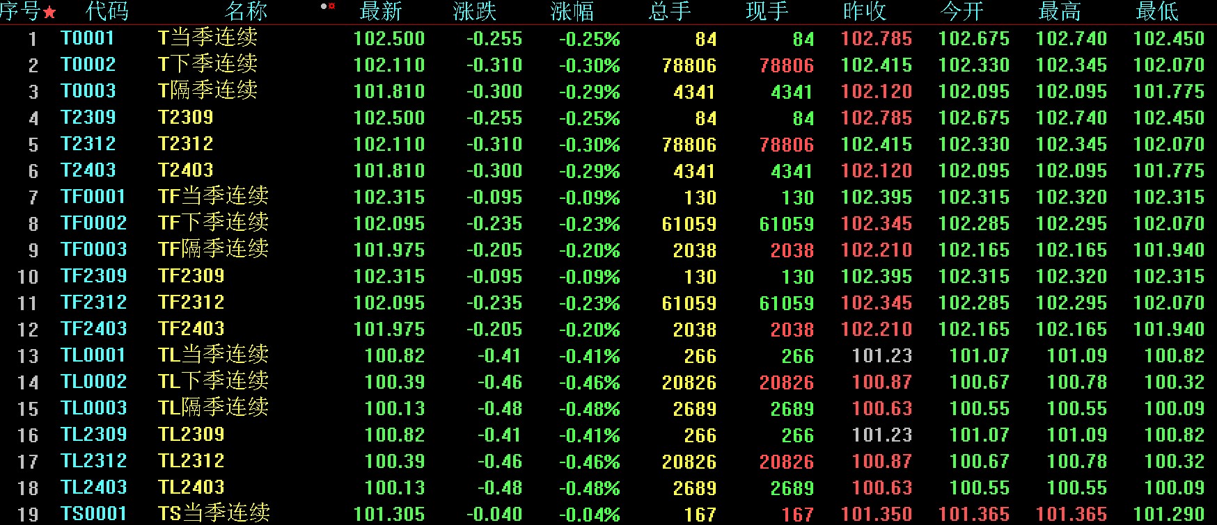 周五,國債期貨收盤全線收跌,30年期主力合約跌0.46%,10年期主力合約跌0.30%,5年期主力合約跌0.23%,2年期主力合約跌0.07%。