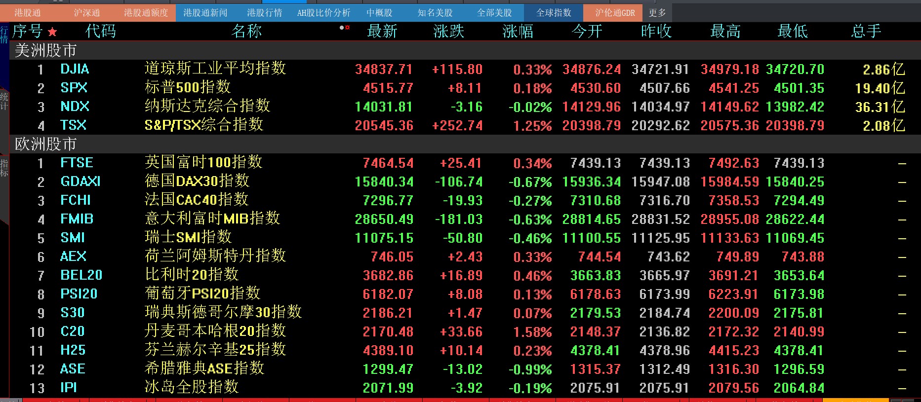 周五,美國三大股指漲跌不一,道指漲0.33%,報(bào)34837.71點(diǎn),標(biāo)普500指數(shù)漲0.18%,報(bào)4515.77點(diǎn),納指跌0.02%,報(bào)14031.81點(diǎn)。本周,道指漲1.43%,標(biāo)普500指數(shù)漲2.50%,納指漲3.25%。