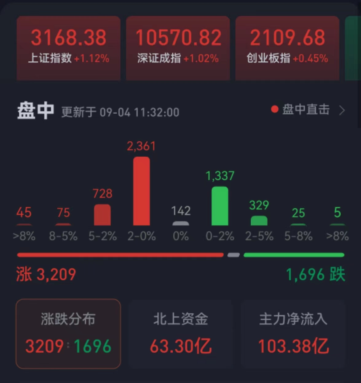 周一(9月4日),三大股指高開高走。截至上午收盤,上證指數(shù)漲幅達(dá)1.12%,報3168.38點(diǎn);深證成指和創(chuàng)業(yè)板指漲幅分別為1.02%和0.45%;滬深兩市合計成交額5495.1億元,總體來看,兩市個股漲多跌少,超3200只個股上漲,其中,41只個股漲停,僅有1只個股跌停。