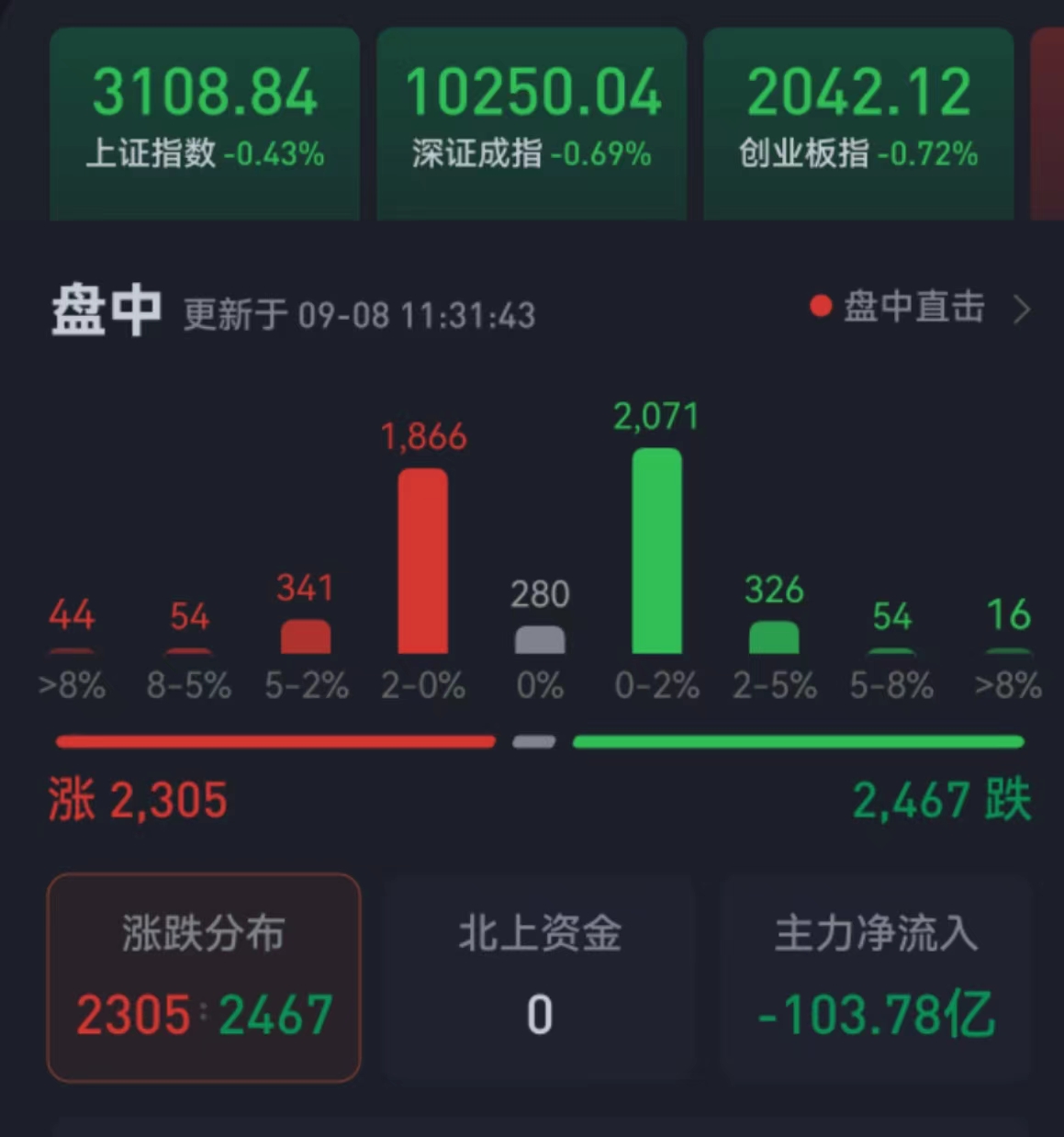 周五(9月8日),三大股指繼續(xù)震蕩回落。截至上午收盤,上證指數(shù)跌幅達(dá)0.43%,報(bào)3108.84點(diǎn);深證成指和創(chuàng)業(yè)板指跌幅分別為0.69%和0.72%;滬深兩市合計(jì)成交額4050.6億元,總體來看,兩市個股跌多漲少。