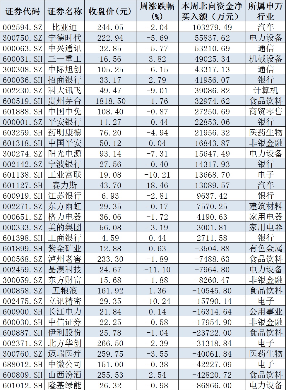 本周,資金方面,北向資金累計凈賣出金額達(dá)47.56億元。從前十大成交活躍股來看,比亞迪、寧德時代、中興通訊等3只個股北向資金凈買入金額均超5億元。另外,隆基綠能、山西汾酒、中微公司、邁瑞醫(yī)療等個股遭北向資金凈賣出金額均超4億元。