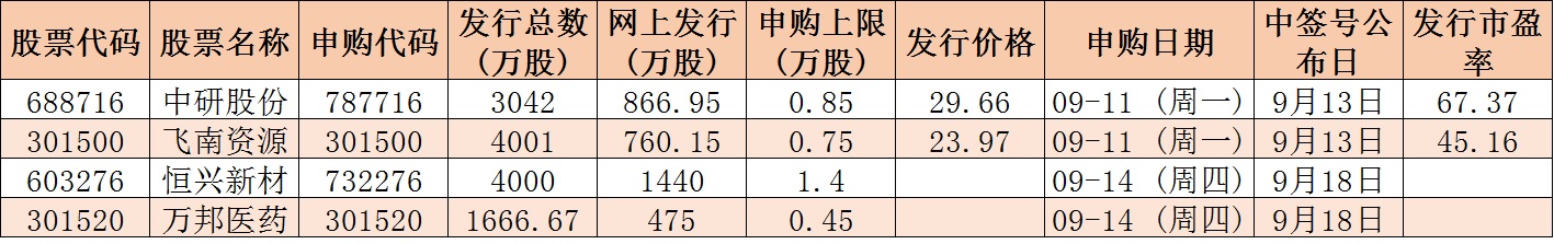 根據(jù)發(fā)行安排,下周有4只新股發(fā)行,其中,9月11日(周一)發(fā)行的是飛南資源、中研股份;9月14日(周四)發(fā)行的是恒興新材、萬邦醫(yī)藥。