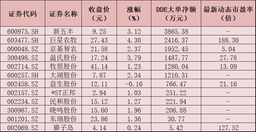 表:9月12日獲大單資金凈買入的養(yǎng)殖業(yè)個股一覽