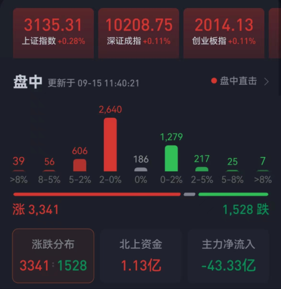 周五(9月15日),三大股指震蕩攀升,全線飄紅。截至上午收盤,上證指數(shù)漲0.28%,報(bào)3135.31點(diǎn);深證成指和創(chuàng)業(yè)板指均漲0.11%;滬深兩市合計(jì)成交額4356.3億元,總體來(lái)看,兩市個(gè)股漲多跌少,超3300只個(gè)股實(shí)現(xiàn)上漲。漲停個(gè)股達(dá)32只,跌停個(gè)股無(wú)。