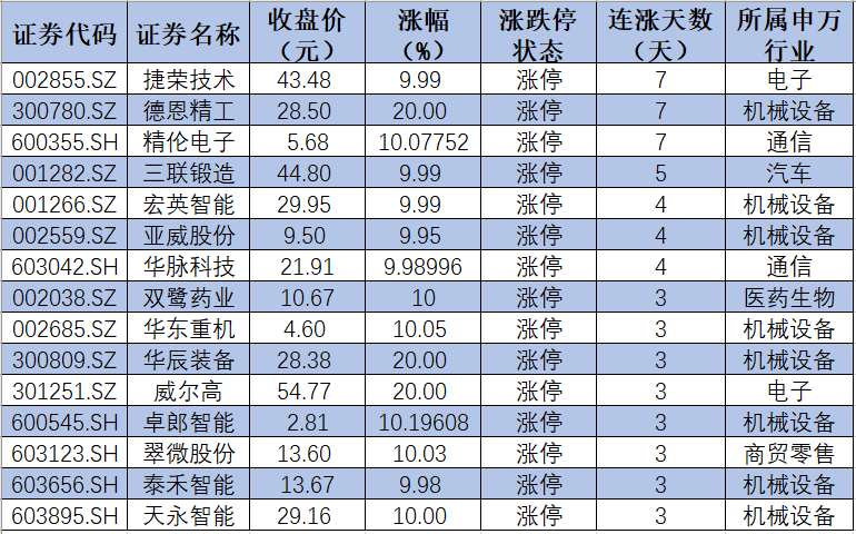 表:連續(xù)上漲3日且今日收盤漲停個股情況