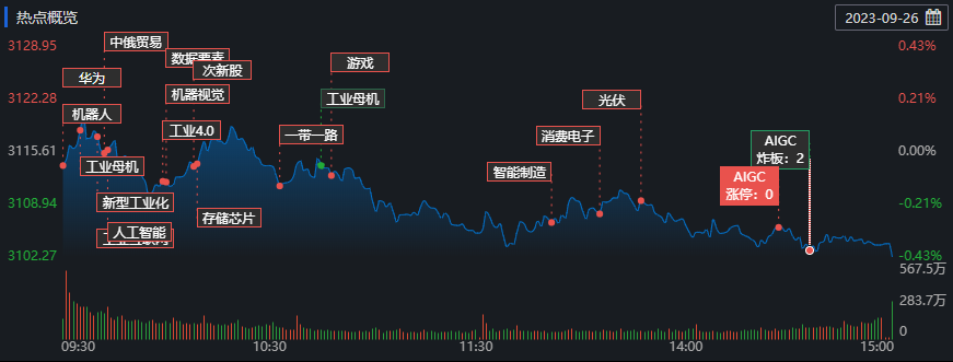 具體熱點板塊方面,新型工業(yè)化板塊領(lǐng)漲,威爾高等9只概念股漲停;工業(yè)母機概念股持續(xù)走強,華辰裝備等個股漲停;語音技術(shù)板塊全天強勢,海天瑞聲、精倫電子漲停;人臉識別板塊集體異動,大華股份等5只概念股漲停;AIGC(生成式人工智能)概念、手機游戲、云辦公、數(shù)字水印、電子身份證等板塊表現(xiàn)活躍。星閃概念板塊領(lǐng)跌,華為海思概念股、石墨電極、PET銅箔(一種具有“三明治”結(jié)構(gòu)的微米級復(fù)合銅箔)等板塊跌幅居前。