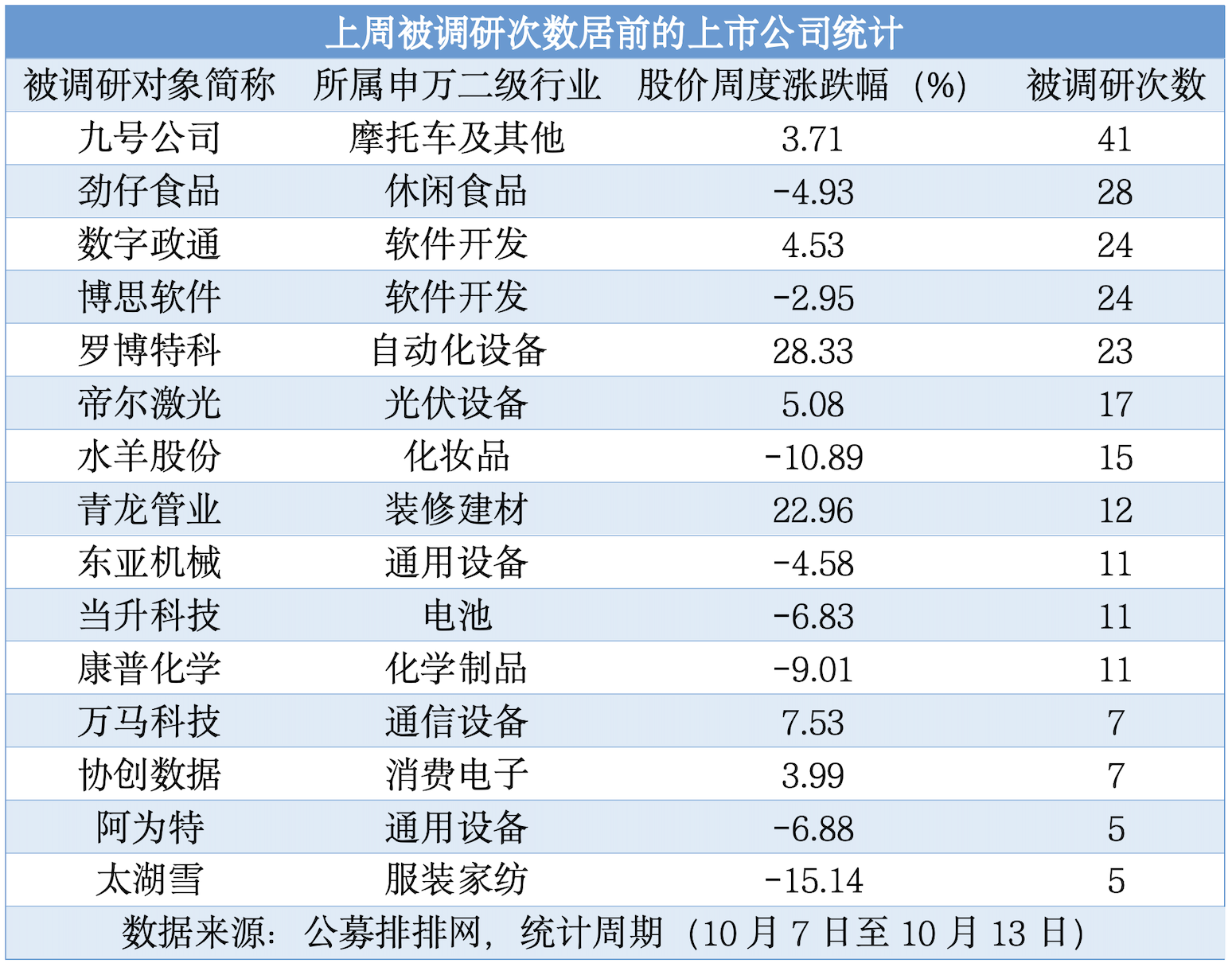 其中,九號公司被公募機構(gòu)調(diào)研41次居首,該公司產(chǎn)品涵蓋智能電動平衡車、電動滑板車、電動兩輪車以及智能割草機器人等短交通和機器人產(chǎn)品。該公司在2024年上半年的營收同比增長了52.20%,凈利潤同比增長了167.82%。另外,勁仔食品、博思軟件、數(shù)字政通、羅博特科等4家公司上周被調(diào)研次數(shù)居前,均被調(diào)研不少于20次。