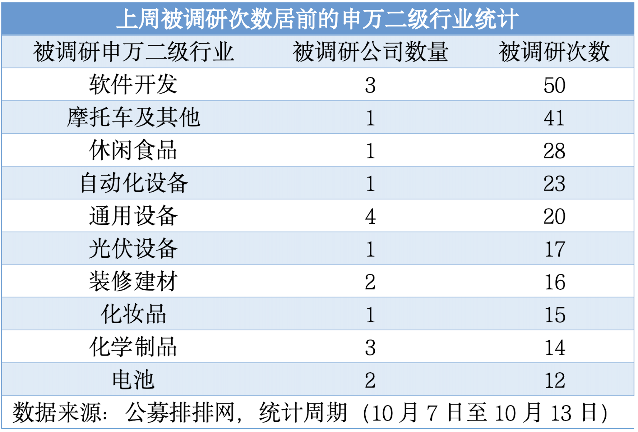 綜合來看,軟件開發(fā)行業(yè)上周有3家上市公司被公募機構(gòu)調(diào)研50次,無論是被調(diào)研次數(shù)還是被調(diào)研上市公司數(shù)量均靠前,成為上周最受公募機構(gòu)青睞的行業(yè)。