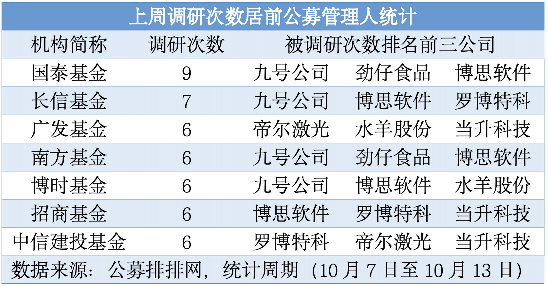 上周參與上市公司調(diào)研的107家公募機構(gòu)中,67家公募機構(gòu)調(diào)研次數(shù)不少于2次,其中51家調(diào)研2次至4次;16家調(diào)研不少于6次。其中,國泰基金上周調(diào)研9次居首。此外,長信基金、廣發(fā)基金、南方基金、博時基金、招商基金、中信建投基金等公募調(diào)研次數(shù)靠前,均調(diào)研不少于6次。