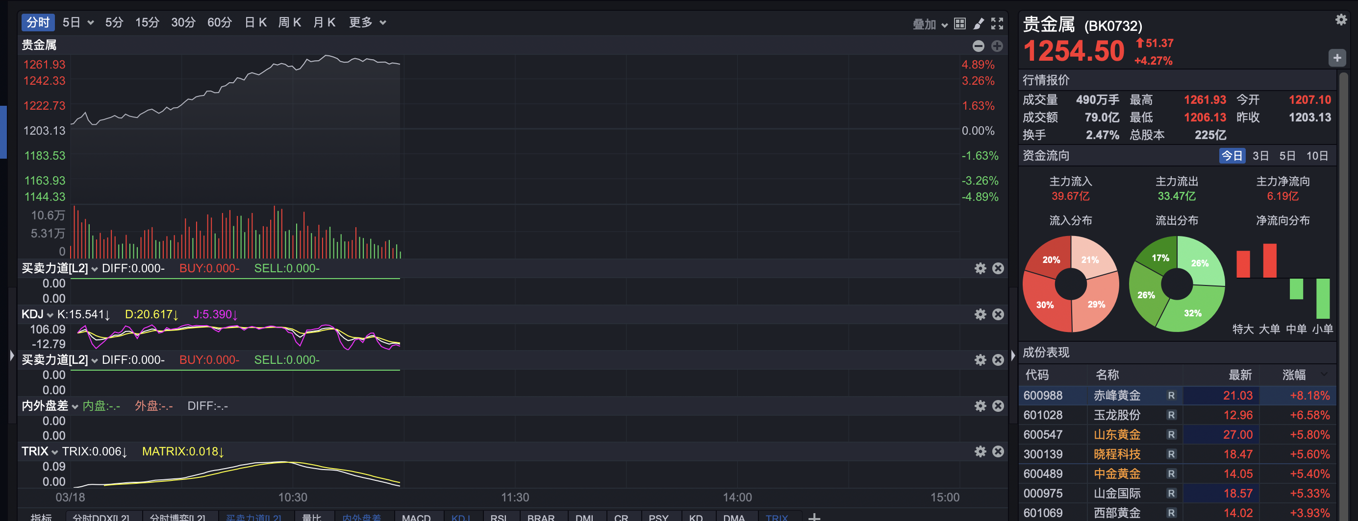 受金價上漲提振,A股市場貴金屬板塊盤中異動拉升,直線上揚。截至記者發(fā)稿時,貴金屬行業(yè)板塊指數大漲4.27%,成份股中,除中潤資源投資股份有限公司(證券名稱:*ST中潤)外,其他個股悉數飄紅,赤峰吉隆黃金礦業(yè)股份有限公司(證券名稱:赤峰黃金)以8.18%的漲幅居前。