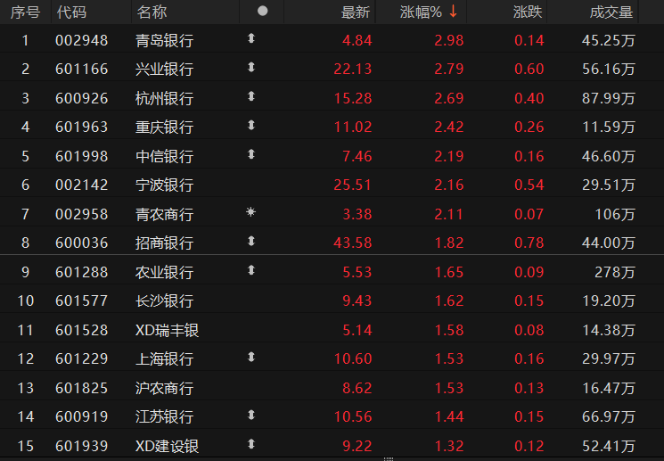 此外,銀行板塊逆勢走高,中國建設(shè)銀行股份有限公司(簡稱“建設(shè)銀行”)股價再創(chuàng)歷史新高,青島銀行股份有限公司(簡稱“青島銀行”)、重慶銀行股份有限公司(簡稱“重慶銀行”)、興業(yè)銀行股份有限公司(以下簡稱“興業(yè)銀行”)等多股漲逾2%。