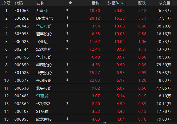 紡織服飾板塊5月9日開盤后表現(xiàn)活躍,個股方面,杭州萬事利絲綢文化股份有限公司(簡稱“萬事利”)實現(xiàn)20cm漲停,華紡股份有限公司(以下簡稱“華紡股份”)走出四連板,浙江迎豐科技股份有限公司(簡稱“迎豐股份”)、飛亞達精密科技股份有限公司(簡稱“飛亞達”)、安徽華茂紡織股份有限公司(簡稱“華茂股份”)等多股漲停。