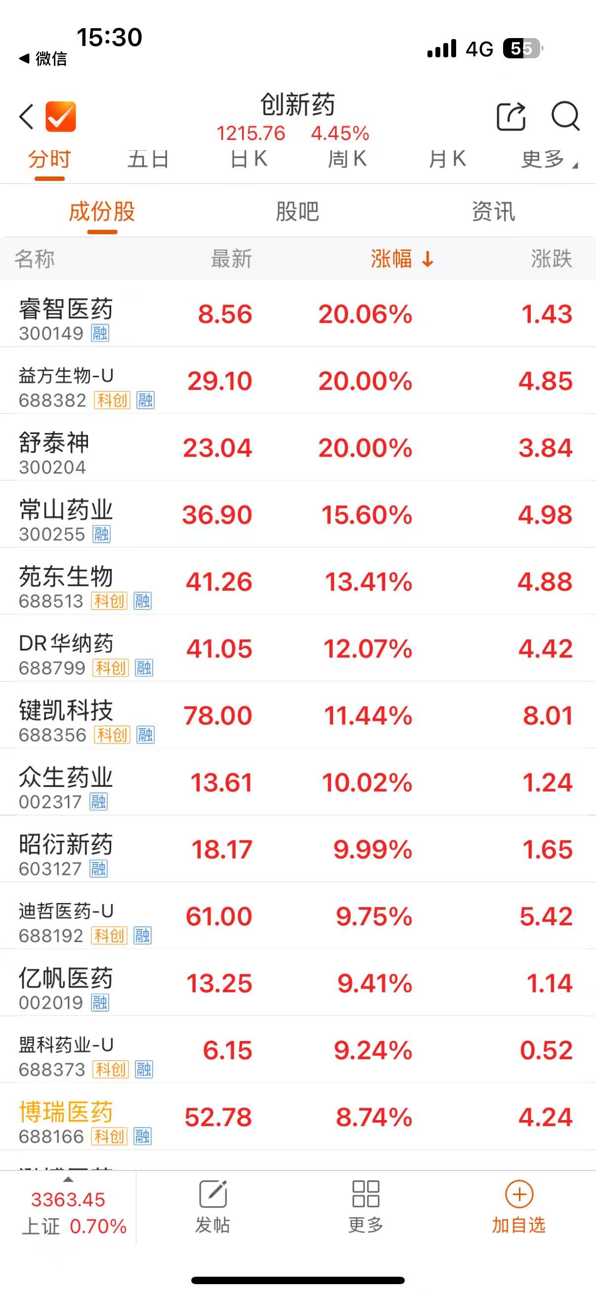 5月29日A股交易時段,創(chuàng)新藥板塊表現(xiàn)強勁,領漲市場。截至收盤,創(chuàng)新藥指數(shù)飆升4.45%,睿智醫(yī)藥(300149)、益方生物-U(688382)、舒泰神(300204)強勢漲停,漲幅均達20%,常山藥業(yè)(300255)、苑東生物(688513)、DR華納藥(688799)等多股亦大幅跟漲,板塊熱度顯著。