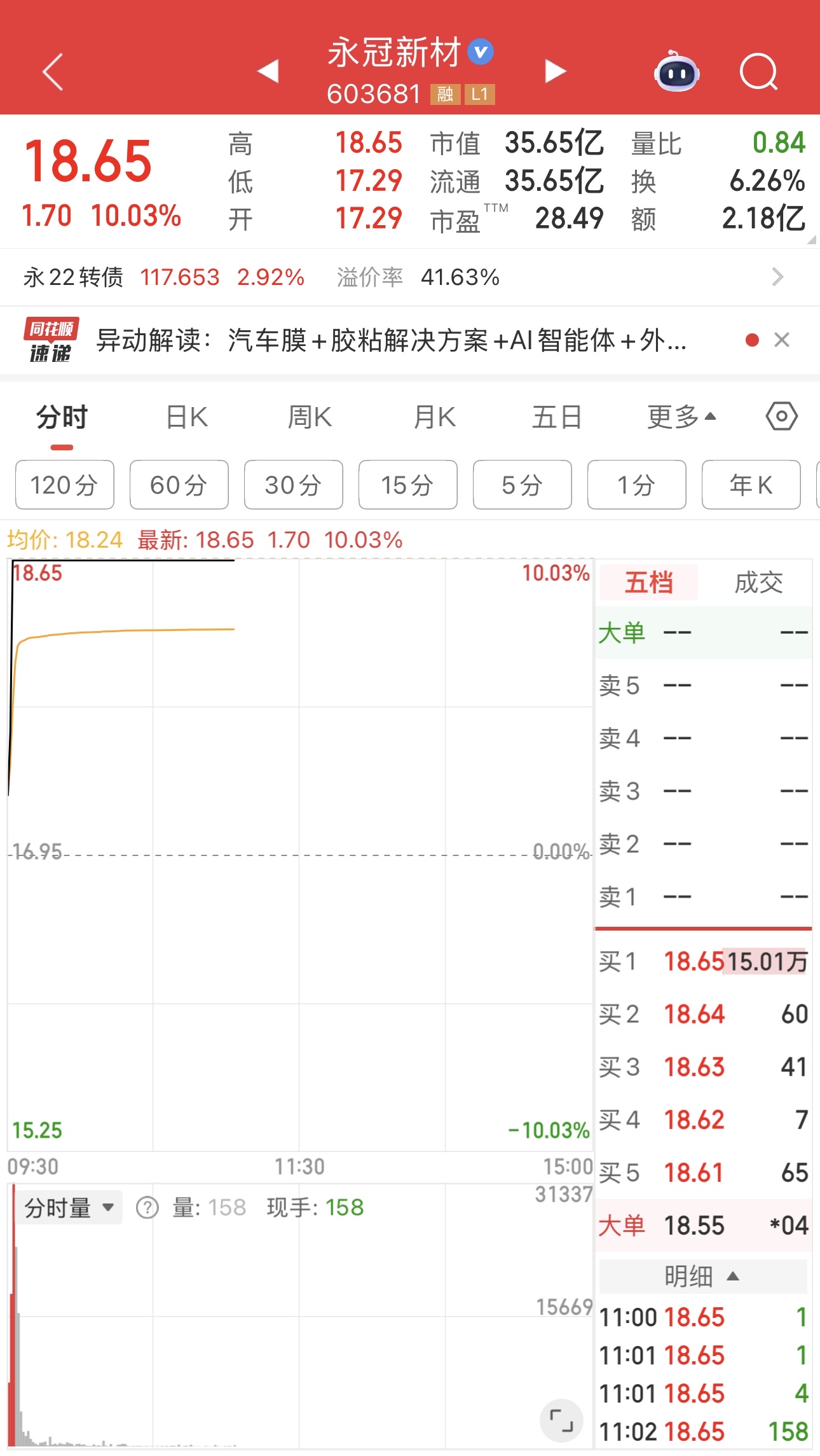 此外,永冠新材(603681)迎來“7天5板”。截至6月3日上午收盤,永冠新材報(bào)18.65元/股,漲幅10.03%,總市值35.65億元,流通市值35.65億元。