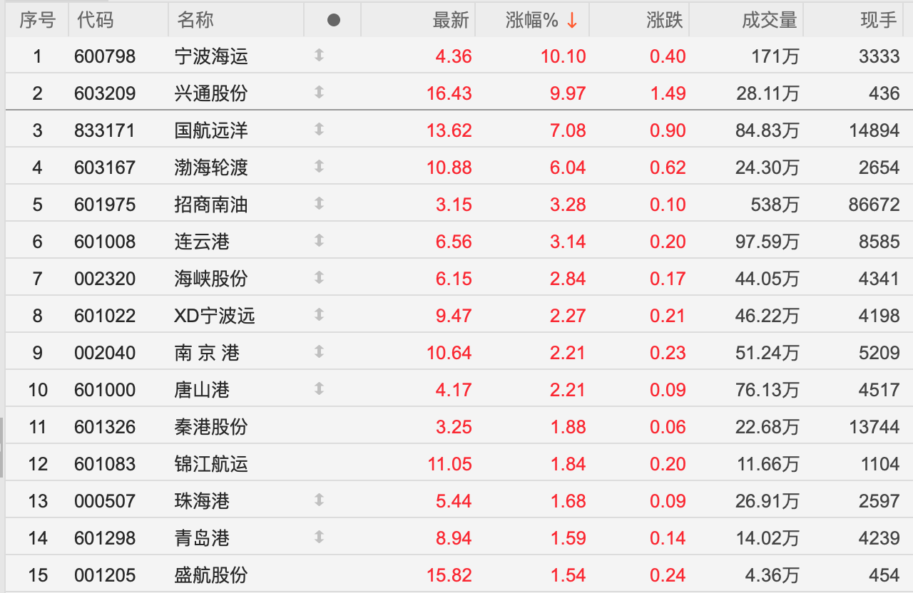6月20日開盤,航運港口板塊震蕩拉升。截至當日收盤,寧波海運(600798)和興通股份(603209)漲停,國航遠洋(833171)和渤海輪渡(603167)漲超5%,招商南油(601975)、連云港(601008)、海峽股份(002320)等多股跟漲。