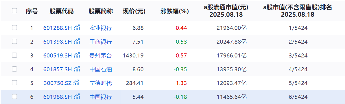 同花順iFind數據統(tǒng)計顯示,截至上午收盤時間,A股市值總和為114萬億元,突破100萬億元,創(chuàng)歷史新高,這也是A股市值歷史上首次突破100萬億元大關。具體來看,截至上午收盤時間,農業(yè)銀行位居A股市值榜首位,約為2.20萬億元,工商銀行A股市值2.02萬億元位居次席。此外,貴州茅臺、中國石油、寧德時代、中國銀行等4股A股市值均超萬億元。