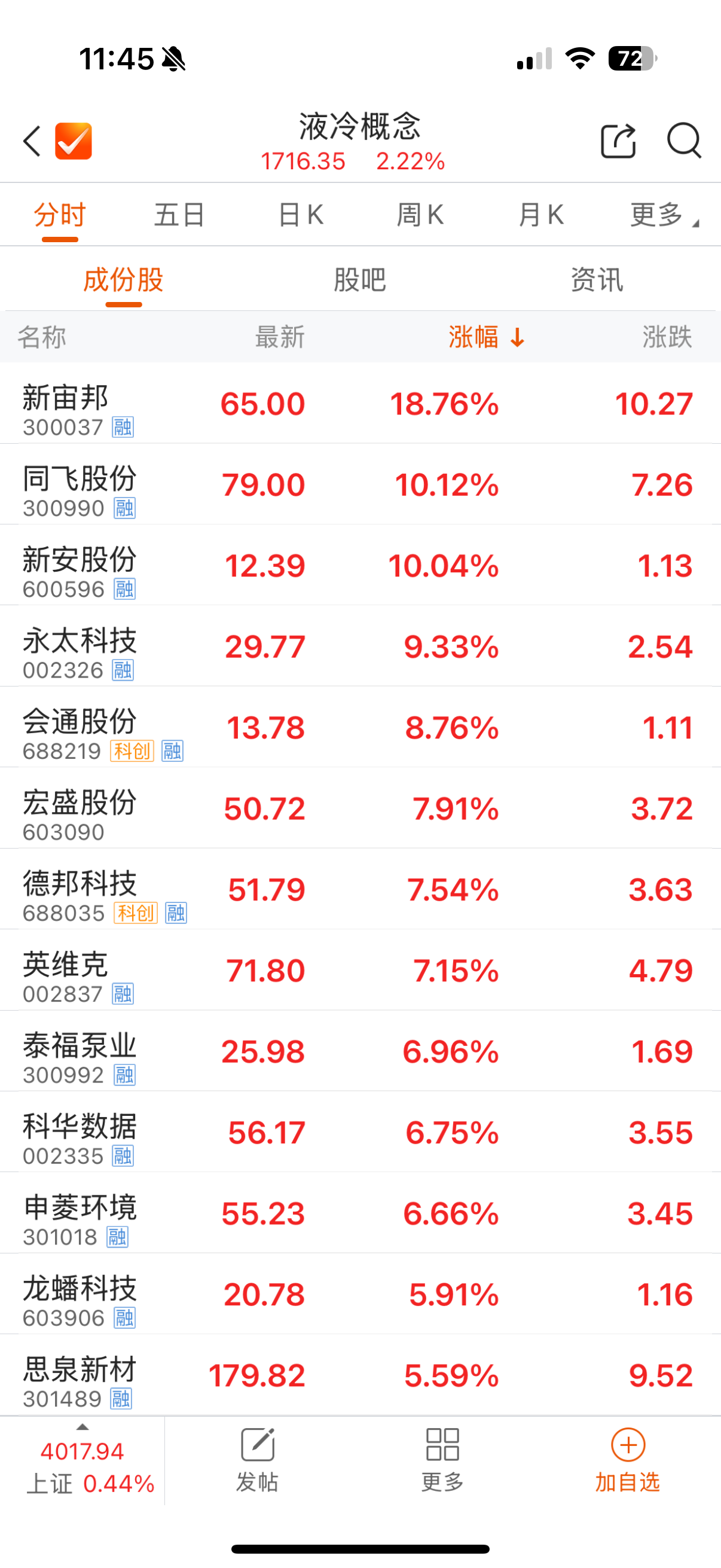 其中,新宙邦(300037)以18.76%的漲幅領(lǐng)漲,超頻三(300647)漲幅達14.10%,同飛股份(300990)漲超10%,新安股份(600596)漲停,英維克(002837)、申菱環(huán)境(301018)等產(chǎn)業(yè)鏈個股跟漲。