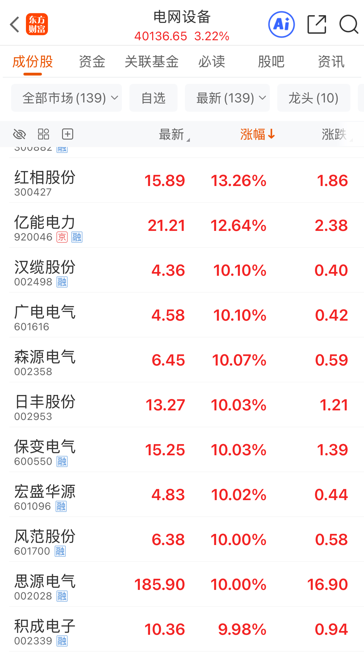 截至記者發(fā)稿時(shí),電科院20cm漲停,漢纜股份、廣電電氣、森源電氣、日豐股份等股票亦漲停,萬(wàn)勝智能、億能電力、紅相股份、平高電氣、雙杰電氣、煜邦電力等多股大漲。