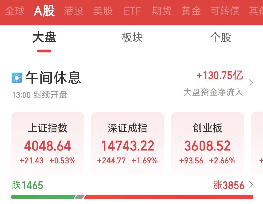 周四(4月16日)早盤,A股三大指數(shù)呈現(xiàn)震蕩上行態(tài)勢,市場情緒整體偏積極。截至上午收盤,上證指數(shù)上漲0.53%,報4048.64點;深證成指上漲1.69%,報14743.22點;創(chuàng)業(yè)板指上漲2.66%,報3608.52點。滬深兩市合計成交額14618.73億元,市場交投活躍??傮w來看,個股漲多跌少,共有3856只個股實現(xiàn)上漲。
