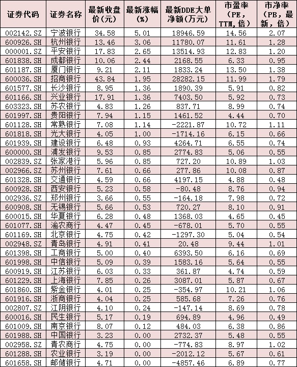 在銀行股不斷被“叫好”的同時(shí),市場資金已悄然加倉布局。統(tǒng)計(jì)發(fā)現(xiàn),周二,在整個(gè)市場資金凈流出的情況下,銀行板塊資金凈流入達(dá)10.4億元。其中,招商銀行、寧波銀行、平安銀行、杭州銀行等個(gè)股,資金凈流入均超1億元,受到市場資金的追捧。