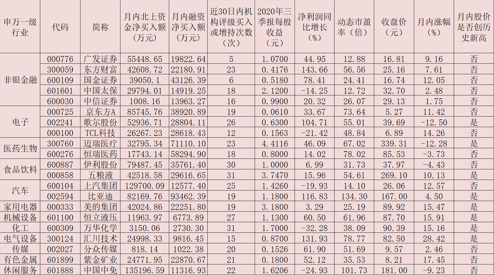 表:11月份以來獲北上資金及融資客同時青睞的個股一覽
