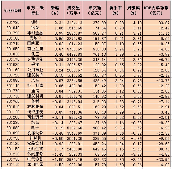 從資金流向來看,有2個(gè)行業(yè)板塊獲得大單資金凈流入,合計(jì)吸金45.01億元,其中,銀行板塊獲得大單資金凈流入33.87億元,非銀金融行業(yè)獲得11.14億元大單資金凈流入。