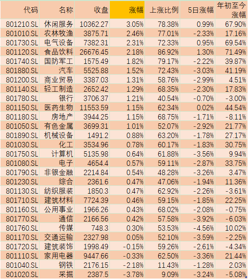 行業(yè)指數(shù)方面,有24類申萬一級行業(yè)指數(shù)上漲,占比85.71%,其中,休閑服務(wù)(3.05%)、農(nóng)林牧漁(2.46%)、電氣設(shè)備(2.31%)等行業(yè)居前三。