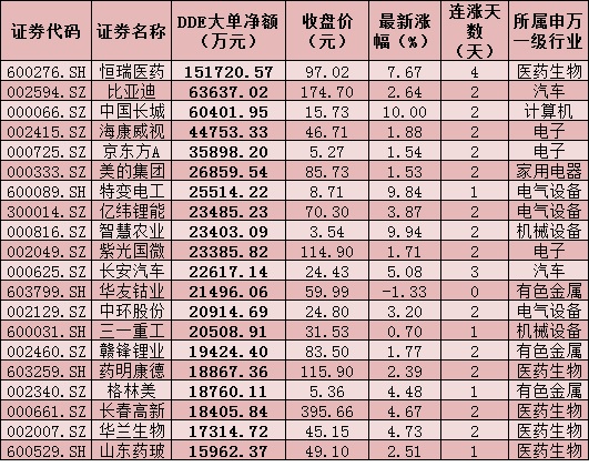 一、周二(12月15日)DDE大單資金凈買入TOP20