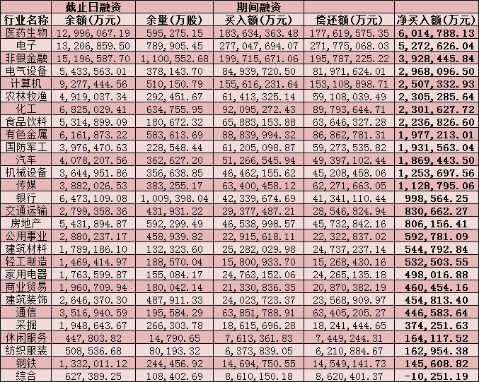 從行業(yè)方面看,今年以來,在申萬一級的28個行業(yè)中,除綜合行業(yè)以外,其他27個行業(yè)被融資客凈買入,其中,醫(yī)藥生物和電子等兩大行業(yè)凈買入額均超500億元,分別為601.48億元和527.26億元,合計達1128.74億元。緊隨其后的是非銀金融、電氣設備、計算機、農(nóng)林牧漁、化工、食品飲料等六行業(yè),融資凈買入額均超200億元,分別為392.84億元、296.81億元、250.73億元、230.53億元、230.16億元和223.68億元。