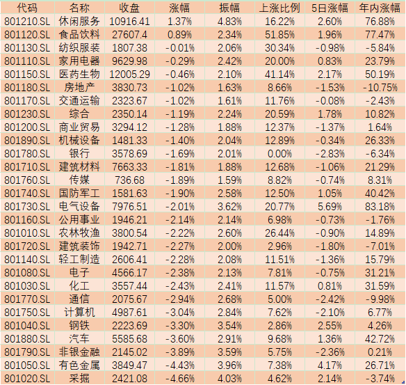 表:12月22日申萬一級行業(yè)市場表現(xiàn)一覽