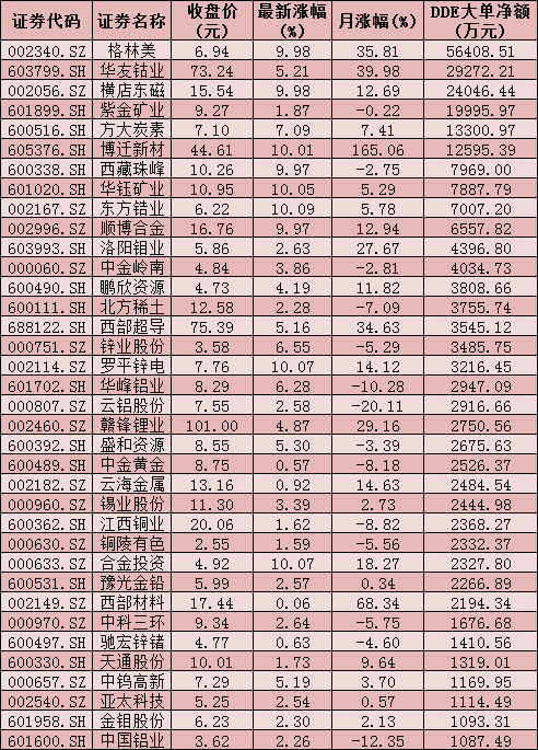 表:12月30日有色金屬行業(yè)資金凈流入超1000萬元的的個(gè)股情況: