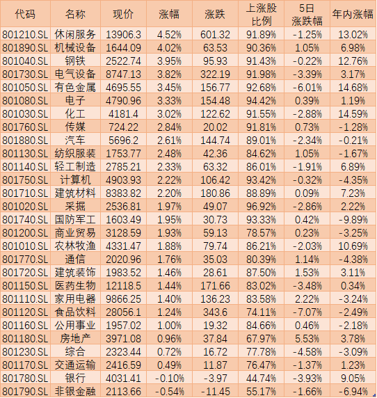 申萬一級行業(yè)指數(shù)方面,有26類行業(yè)指數(shù)上漲,休閑服務(wù)(4.52%)、機(jī)械設(shè)備(4.02%)、鋼鐵(3.95%)等居前三位,僅非銀金融(-0.54%)、銀行(-0.10%)兩類行業(yè)小幅回落。個股方面,A股呈普漲格局,漲跌比達(dá)7.44。