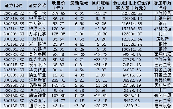 從滬股通、深股通前十大成交活躍股來看,節(jié)后以來的10個交易日中,共有37只個股現(xiàn)身前十大成交活躍股榜單,19只活躍股處于期間凈買入狀態(tài),北上資金合計凈買入182.79億元。其中,寧德時代(32.5億元)、中國平安(22.48億元)、招商銀行(21.48億元)、牧原股份(15.28億元)、萬華化學(12.38億元)、萬科A(12.19億元)、興業(yè)銀行(11.13億元)、平安銀行(10.02億元)等個股期間北上資金合計凈買入額居前,均在10億元以上,多數(shù)為藍籌股。