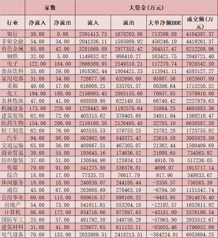二、周三(3月3日)申萬一級行業(yè)大單資金流向