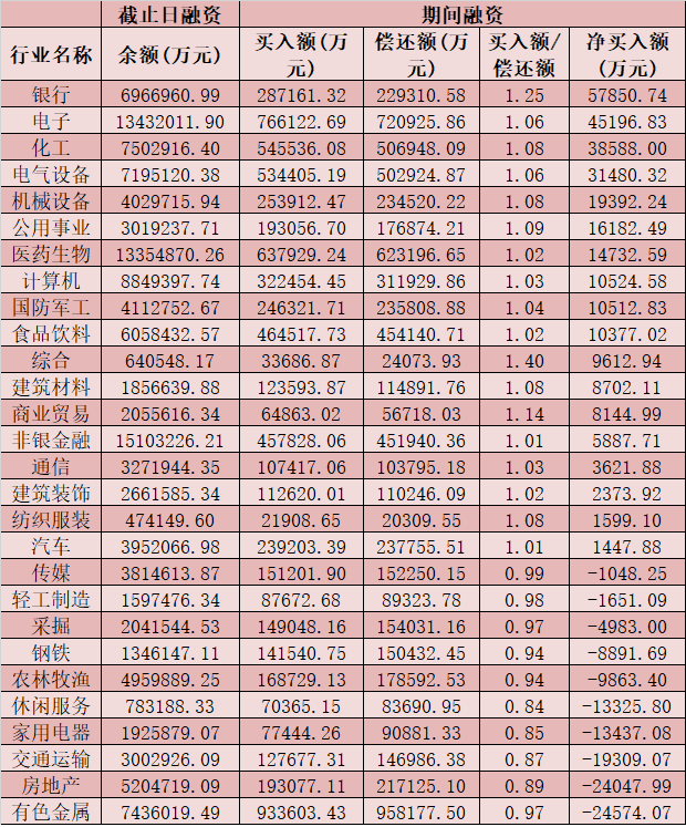 六、截至3月2日申萬級一級行業(yè)兩融交易情況