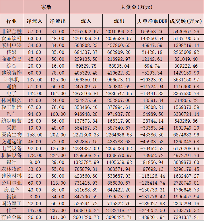 二、周五(3月5日)申萬(wàn)一級(jí)行業(yè)大單資金流向