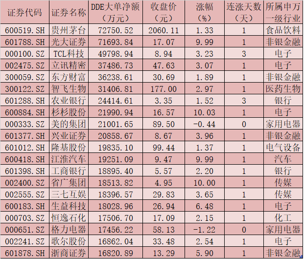 從資金層面看,周五,A股大單資金整體凈流出162.39億元,其中,有1751只個(gè)股呈現(xiàn)資金凈流入,2365只個(gè)股呈現(xiàn)資金凈流出。從申萬(wàn)一級(jí)的28個(gè)行業(yè)來(lái)看,有6個(gè)行業(yè)呈現(xiàn)資金凈流入態(tài)勢(shì),其中,非銀金融和食品飲料等兩大行業(yè),資金凈流入居前均在10億元以上。光大證券表現(xiàn)強(qiáng)勁,股價(jià)漲停。