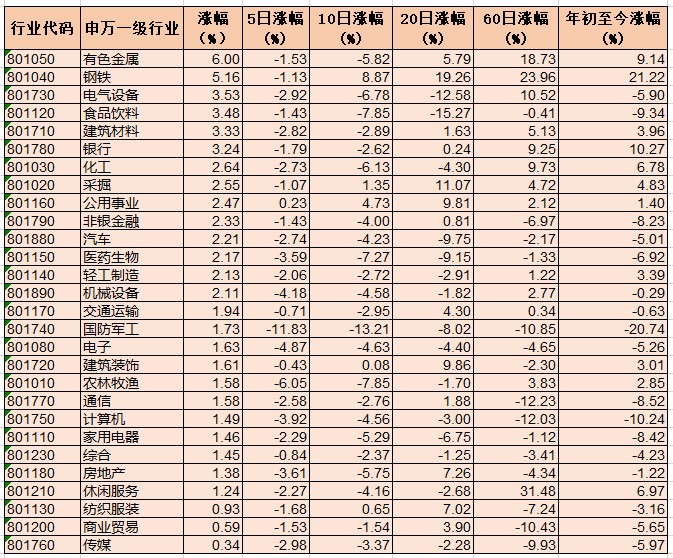 從行業(yè)指數(shù)表現(xiàn)來看,今日申萬一級(jí)28個(gè)行業(yè)指數(shù)全部實(shí)現(xiàn)上漲,有色金屬行業(yè)指數(shù)領(lǐng)漲,漲6%,鋼鐵行業(yè)指數(shù)緊隨其后,漲5.16%,電氣設(shè)備、食品飲料、建筑材料、銀行等4個(gè)行業(yè)指數(shù)漲幅均超3%。