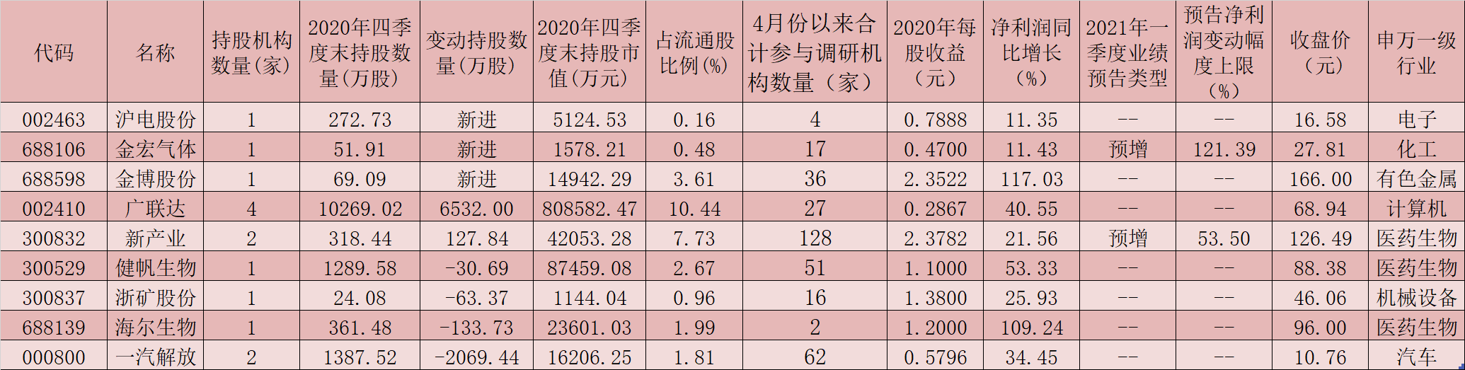 良好的業(yè)績表現(xiàn)或是近期機構(gòu)頻繁調(diào)研的重要支撐。在上述4月份以來被機構(gòu)調(diào)研的54家公司中,截至4月11日,已有50家公司披露了2020年年報業(yè)績,40家公司報告期內(nèi)實現(xiàn)凈利潤同比增長,占比八成。雙星新材、漢威科技、漢王科技、金博股份、海爾生物等5家公司報告期內(nèi)均實現(xiàn)凈利潤同比翻番。