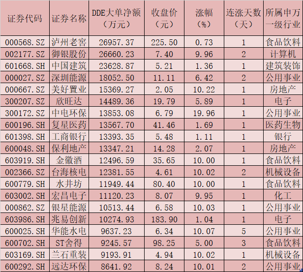 一、周一(4月12日)DDE大單資金凈買入TOP20