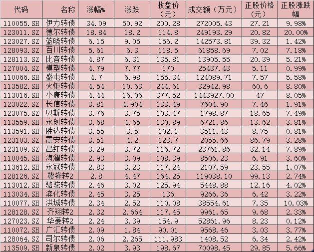 記者進(jìn)一步統(tǒng)計發(fā)現(xiàn),上述26只漲幅超2%的可轉(zhuǎn)債中,德爾轉(zhuǎn)債、洪城轉(zhuǎn)債、伊力轉(zhuǎn)債等3只今日正股價格均實(shí)現(xiàn)漲停,火炬轉(zhuǎn)債(8.80%)、小康轉(zhuǎn)債(8.05%)、昌紅轉(zhuǎn)債(7.89%)、貝斯轉(zhuǎn)債(7.49%)、百川轉(zhuǎn)債(7.18%)、新泉轉(zhuǎn)債(5.66%)、盛屯轉(zhuǎn)債(5.58%)和比音轉(zhuǎn)債(5.21%)等8只正股價格漲幅也均在5%以上。